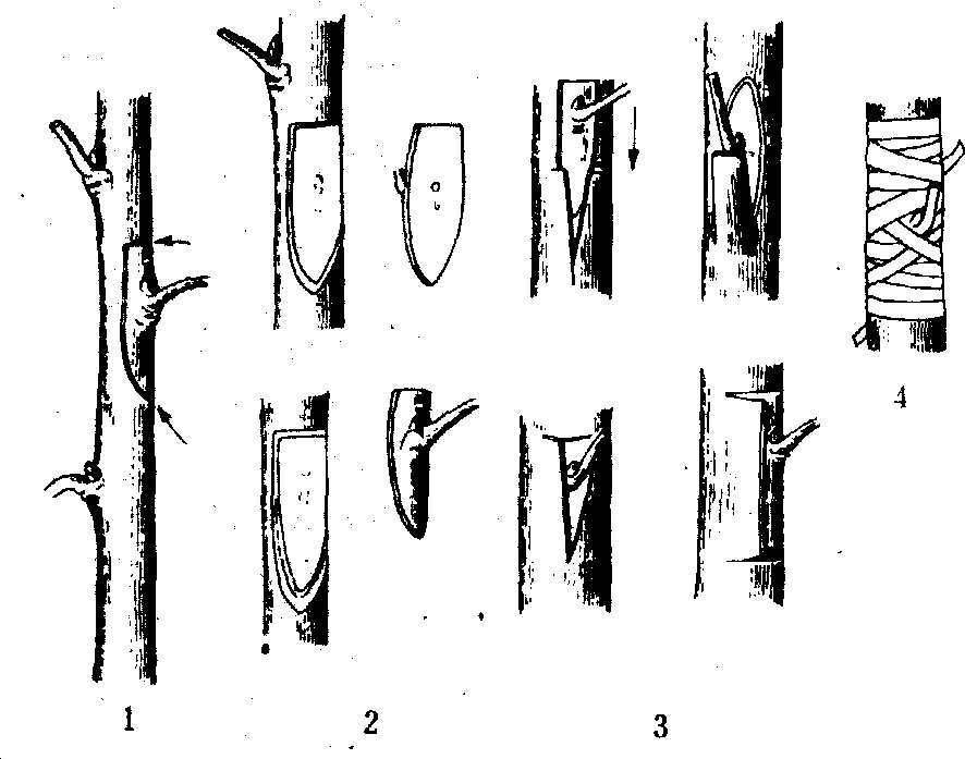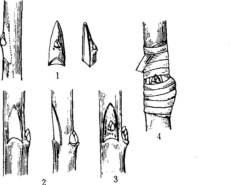 图 1 T形芽接 1. 削取芽片; 2. 剥下芽片; 3. 插入芽片; 4. 绑缚状态