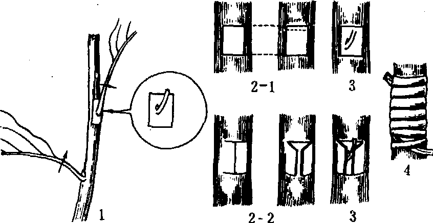图 2 贴皮芽接 芽接方法 主要有❶T形芽接。中国称丁字形芽接, 芽片削成盾形, 插入砧木的T形接口, 故名T形芽接。操作步骤是削取芽片, 先在芽尖上方横切一刀深达木质, 再自芽下方带少量木质削起, 至横刀口剥下芽片,要求皮层内面光滑; 在皮层不易剥离情况下,也可削成带有薄木质的芽片进行嫁接。其次, 砧木切口, 横、竖各1刀成T形, 深达木质, 剥开皮层。插入接芽后, 使其紧贴砧木, 芽片上切口应与砧木横切口相接, 绑扎严密, 只露叶柄和芽尖(图1); 有的将砧木切口改为一横一切口,剥下芽片, 砧木上切割成“I”或⦌”形接口, 其大小要与接穗芽片相应, 或者剥去与芽片大小相同的一块砧皮。最好用能调节间距的双刃芽接刀切取, 剥下砧木切口皮层, 贴上相同大小的接穗芽片; 或剥开砧木切口插入芽片, 绑扎严密即成(图2)。本法操作复杂, 要求砧、穗粗细接近一致,除柿树外, 已较少利用。 ❸管状芽接。芽片呈管形。操作步骤点, 即在横刀口下不刻划竖的切口, 用刀尖点破皮层并向两边翘起, 顺势插入芽片; 橘苗茎呈菱形, 砧木切口也可切成“T”形,芽片从一侧插入。 ❷贴皮芽接。芽片方形, 中国也称方块芽接俗称热贴皮。先在接穗上切割深达木质部的方形为接芽上下各切割深达木质部的环形切口, 再于芽背方向两环切口间纵向切割, 剥下管状芽片、按接穗芽片剥取方法在砧木上切割同等大小的切口, 剥去皮层, 换贴上接穗芽片, 绑缚严密即成。也有芽片不开口而用手拧下后扎自梢端取出, 套于砧木切口的套管芽接法(图3)。管状芽接砧、穗间接触面大, 容易成活, 是较原始的方法, 因其操作复杂, 并要求砧、穗生长粗细一致, 生产上已无应用。 ❹嵌芽接。芽片长盾形基部平截, 削取时第一刀在芽的上方, 先斜向切入木质部, 然后垂直下切,第二刀在芽下方45度角切入与第一刀口相交,取下带有木质的接穗芽片; 在砧木上做形状、大小相同的切口, 剔去芽片, 嵌入接穗芽片, 对准两侧形成层(至少要有一侧对准), 绑缚严密, 牢固,注意保湿,以提高成活率(图4)。 ![]() 图 3 管状芽接