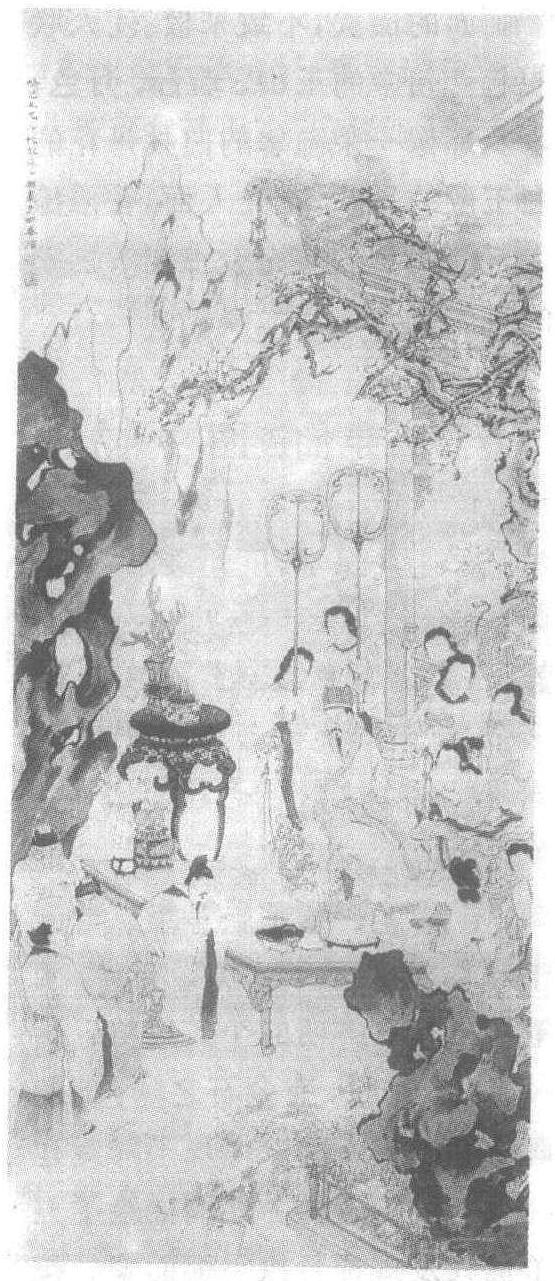 | 释义 | 苏六朋清平调图轴清。苏六朋绘。纸本设色。纵132厘米,横101.5厘米。广东省广州美术馆藏。此幅写唐天宝年间唐玄宗召李白作“清平调”的故事,作于道光十三年(公元1833年),为苏氏早年具有代表性的作品。天宝初年,李白在长安供奉翰林。一日,玄宗与杨贵妃在宫中观牡丹花,因命李白写新乐章。李白奉诏而作《清平调词三首》,诗中把牡丹与杨妃交互在一起写,以花喻人,以人比花,人面花光浑融一片,深得玄宗赞赏。画面的中心是三个主要人物——玄宗、杨贵妃与李白。人物的周围是亭台、湖石、牡丹、白雾组成的一个三角形,如诗一般的意境。按诗中所言,玄宗、杨妃的赏花地点在“沉香亭北”。在画面的右上部画了亭子的一角,玄宗皇帝坐在亭台下的一把木根椅上,他的右边坐着美艳的贵妃,身边一群宫女,或执扇,或持乐器,或捧茶,各司其职。在玄宗的注视下,李白正伏案舐笔。他头戴学士巾,白衣阔袖,神态盎然,似乎成竹在胸。在他身后几名内监窃窃私语。玄宗略显老态,面向贵妃而坐,深露出对她的宠爱,头却转向李白,神情专注,似在急切地等待着李白新作的问世。而杨贵妃微露倦怠之意,虽“常得君王带笑看”,也掩饰不住深居内宫的寂寞无聊。他们的神态,更加反衬出诗人李白的豪放、洒脱的风度。人物呼应紧凑,周围摆设豪华而雅致,显示出皇宫的气派。画家没有采用绚丽的色彩来表现宫廷生活,而以墨线勾勒人物衣纹,淡色渲染;面部以赭石微染,生动传神;家具与亭台也是浅色调的;牡丹花与玉兰花也是白色的;只有二块高大的湖石皴染较重,增加了画面的层次,不致呆板。使人联想起诗句中的玉山、瑶台、月色,以及那像一朵温馨的白牡丹花的白玉般的人儿。花光人面,香浓撩人,优雅而风流,充分表现了画家的笔墨造诣与艺术修养。