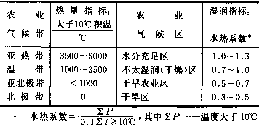❹亚热带, 显著的气候特点是冷、暖两季。6月份的昼长小于15小时, 12月份的昼长约9小时。本带南部作物可全年生长, 通常可收两季, 一季在夏初或5月末, 另一季在秋季。冷季可栽种抗寒的冬性禾本科作物; 暖季可栽种喜温作物及多年生的木本作物; 棉花、水稻、烟草、茶树、柑桔以及南方果树等。再用水热系数将农业气候带划分成农业气候区。温带分为5个农业气候区, 亚热带分为7个农业气候区,亚北极带未分区。农业气候区内,再按气候的大陆度分为若干农业气候省(见表1)。时期内(通常为6~8月)的总降水量;∑t——日平均气温大于10℃期间的积温