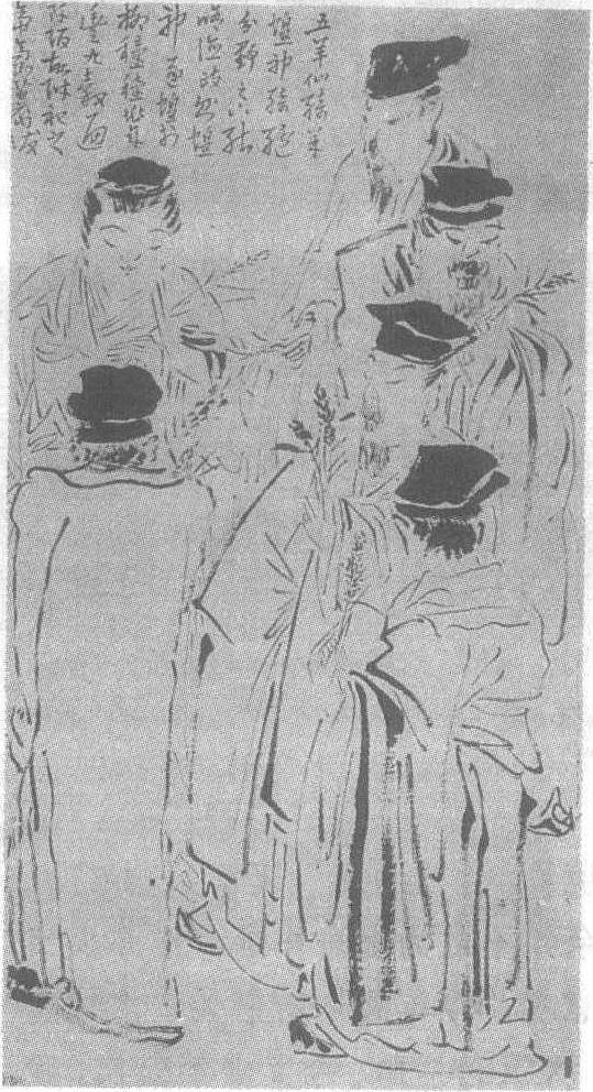 | 释义 | 苏长春五羊仙迹图轴清。苏长春绘。纸本墨笔。纵178.5厘米,横67.5厘米。广州美术馆藏。苏长春(公元1813—?),字仁山,静甫,别署教圃、灵峰、寿庄等20多个。广东顺德杏坛人。与苏六朋同里,称“二苏”。仁山少聪,12岁因画有名闾里,是一位早熟的画家。曾二次参加科举考试均未中。工山水、人物,兼写花卉,用笔构图均有鲜明的个人风格,画风朴质、超脱,有金石之味。他的画作不迎合时尚,体现了对封建礼教的反抗精神。此图描绘了五羊仙人及蝗神各执谷穗而聚。按《南部新书》说:“吴修为广州刺史,未到州,有五仙人骑五色羊,负五谷而来。今州厅梁上画五仙,骑五色羊为瑞,故广南谓之五羊城。”(以五羊神话故事名广州城为“羊城”、“穗城”)。此画构图非常新奇,不流于传统,人物排列紧凑,把画面填得很满。以焦墨略带枯笔,落笔飘洒,纵横自如,线条粗细、疏密、轻重处理得当而自然,气贯神通,秀骨宛然。人物造型简约生动几近漫画,虽落笔草草,但人物特征十分鲜明。画面左上部有自题行书九行,清劲雅逸,秀骨挺立,与画作相得益彰。苏长春常画仙道人物,但却充满了人间情意,独具风格。