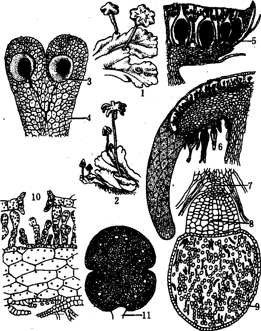 苔纲Hepaticae苔藓植物门中较原始的一个分类群。配子体通体为叶状体,有的有类似茎叶的分化,多为背腹式,无中肋,假根为单细胞结构。蒴柄短小或细长柔弱,在孢蒴成熟之后发育。孢蒴成熟时纵裂或不规则开裂。无蒴轴、蒴盖、蒴齿、环带等构造,孢子常借弹丝的干湿运动而散布。孢子萌发时,原丝体阶段不发达,每一原丝体只发育成一配子体。常生于阴湿的土表、岩石、树干、枝叶上,有的水生。热带和亚热带常绿林内生长繁茂,种类尤为丰富。本纲通常分为地钱目(Marchantiales)、叶苔目(Jungermanniales)和角苔目(Anthocerotales) 3目,也有的分为7个目,约10 000种,中国约有600种。 |