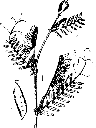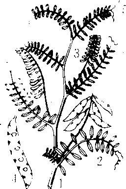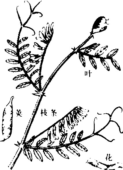 蓝花苕子 1.开花结荚枝条 2. 叶 3. 花序 4. 荚 5. 卷须 |