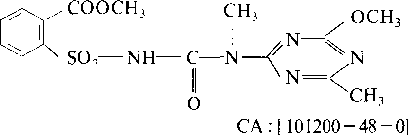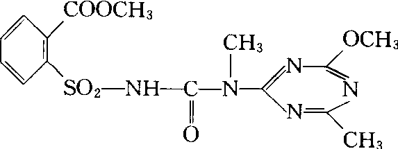 性能 本品为白色固体,无味,熔点141℃,蒸气压3.6×10-5帕/25℃。在有机溶剂中的溶解度(毫克/升): 甲醇为3.39,醋酸乙酯为17.5,丙酮为43.8乙腈为54.2;水溶度因pH而异: pH4.0为28,pH5.0为50,pH6.0为280毫克/升。对温血动物的毒性很低,大鼠口服LD50>5000毫克/千克,对野生动物及鱼类的毒性低。加工剂型为75%干燥胶悬剂或可湿性粉剂。 作用机制 作用机制与其他磺酰脲除草剂品种近似,即通过植物的根、茎、叶吸收后,迅速传导,抑制乙酰乳酸合成酶(ALS)的活性,阻碍缬氨酸与异亮氨酸生物合成,造成生长受抑制,植株在1~3周内死亡。抗药性作物小麦吸收药剂后,在体内能迅速将其代谢而形成葡萄糖轭合物,故不受害。阔叶净在土壤中主要通过水解作用而迅速消失,在酸性土中水解作用迅速,如pH为7时,半衰期6天,pH4~3时,半衰期仅1天。在正常用量条件下,施药后经60天,可以安全种植各种作物,因而适于在多熟制地区的麦田应用。 应用 阔叶净用于小麦、大麦、燕麦等作物地防治田蓟、繁缕、播娘蒿、藜、蓼、反枝苋、田芥及宝盖草、麦家公等对2,4-滴有抗药性的阔叶杂草,每公顷有效用量10~20克,在作物出苗后、杂草幼龄阶段喷药,加入非离子型表面活性剂能提高杀草活性。阔叶净对田旋花、野燕麦、狗尾草等防治效果差,可与其他除草剂混用。阔叶净在土壤中的持效期因用量、土壤类型、气候条件及杂草群落组成而异,一般不超过30天,因而对轮作中各种后茬作物无害。 苯磺隆tribenuron-methyl又称阔叶净、巨星。磺酰脲类内吸、选择性、超高效除草剂。化学名称:2-〔(4-甲氧基-6-甲基1,3,5-三氮苯-2-基)-甲氨基羰基氨基磺酸基〕苯甲酸甲酯。化学结构式如下。原药为白色固体,密度1.54,熔点141℃,25℃时蒸气压为52.0×10-10 Pa,微溶于水及多种有机溶剂。可被杂草的茎、叶和根吸收并传导,抑制缬氨酸、亮氨酸和异亮氨酸的生物合成而致死。禾谷类作物有很好的耐药性,适于小麦、大麦等作物使用,防除田蓟、繁缕、猪殃殃、麦家公、播娘蒿、宝盖草、地肤、蓼、荠菜、猪毛菜等阔叶杂草。对人畜低毒,大鼠急性口服LD50>5 000 mg/kg,兔急性经皮LD50>2 000 mg/kg,大鼠急性吸入LC50>5 mg/L。对眼有轻微刺激,对鱼类及鸟类低毒。