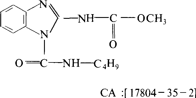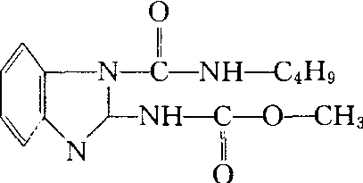 性能 纯品为白色结晶,带有轻微的苦辣味,熔化时分解。室温不易挥发,不溶于水和油,溶于丙酮、氯仿和二甲苯。对温血动物低毒。对大鼠LD50>10000毫克/千克,对家兔急性经皮LD50为10000毫克/千克。对皮肤有轻微刺激性,但不引起皮炎。以2500毫克/千克剂量喂饲大鼠90天,无中毒反应。对雄野鸡和鹌鹑LD50>10000毫克/千克,对鲤鱼48小时TLm7.5毫克/升。高效、广谱,具有保护、治疗和铲除作用。它对子囊菌纲和半知菌类的许多病原菌有良好的生物活性。对某些担子菌引起的病害如黑穗病,也有一定的防治效果。对锈病效果不佳,对藻菌纲真菌病害无效。其作用机制为干扰细胞的有丝分裂过程,而起抑菌作用。可采用喷洒、拌种和土壤处理等方法施用。对螨卵也有一定的防治效果。 应用 主要用于蔬菜、果树和各种经济作物病害的防治,也用于麦类赤霉病和大豆菌核病的防治。以167~250毫克/升浓度,在发病前或发病初期喷雾,可有效地防治瓜类灰霉病和炭疽病、茄子灰霉病、番茄叶霉病、葱类灰色腐败病、芹菜灰斑病、柑桔疮痂病和灰霉病、苹果黑星病和黑点病、梨黑星病、葡萄褐斑病和白粉病、花生褐斑病等。以333~500毫克/升喷洒可防治麦类赤霉病和大豆菌核病。以每千克种子用药有效成分1~2克拌种可防治麦类黑穗病。土壤处理防治棉花黄萎病和枯萎病也有一定的效果。此外喷洒或浸渍方法还可用于水果和蔬菜保鲜。药剂长期连续施用,可使病原菌产生抗药性,与多菌灵有交互抗药性。与其他药剂交替使用或混用,可延缓抗药性的生成。但不能与波尔多液和石硫合剂等碱性农药混用。加工剂型主要为50%可湿性粉剂。 苯菌灵benomyl又称苯来特。杂环类杀菌剂。化学名称:1-正丁氨基甲酰-2-苯并咪唑氨基甲酸甲酯。化学结构式如下。原药为白色结晶,具微辛辣味,不易挥发,不溶于水和难溶于一般溶剂,可溶于氯仿、丙酮中。1967年由美国杜邦公司推广,广谱内吸性杀菌剂,具有保护、治疗、铲除作用及杀螨卵作用。由于它在水介质和植物体内易被分解为多菌灵,最终以多菌灵对病菌发挥作用。因此其抗菌谱、杀菌作用、防治对象等均与多菌灵、硫菌灵相似。但苯菌灵在低浓度下有时效果比多菌灵好,这可能与其结构中丁胺甲酰基提高药剂的亲酯性以及分解产物异氰酸丁酯具抑制真菌糖代谢有关。对植物安全、对人畜低毒。小鼠口服急性LD50>5 000 mg/kg,大鼠经皮急性LD50>10 000 mg/kg,鲤鱼耐药中量(TLM)7.5 mg/L(48 h)。