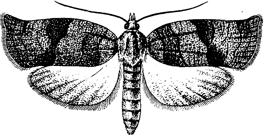 | 释义 | 苹果卷叶蛾apple leaf roller苹果等果树的卷叶害虫。又名黄色卷蛾,苹大卷叶蛾。学名Choristoneura longicellana (Walsingham)。鳞翅目,卷蛾科。已知于朝鲜、日本、苏联(西伯利亚)及中国黑龙江、吉林、辽宁、山东、河北、河南、安徽、江苏、湖北、陕西等省均有分布。幼虫为害苹果、梨、桃、樱桃、柿、杏、山楂、核桃、鼠李、栎、山槐、柳等。成虫体黄褐或暗褐色。雄虫翅展19~24毫米,头部有淡黄褐色鳞毛,前翅近四方形,前缘褶大,缺基段,全翅呈淡黄褐色,有深色基斑和中带,在近基部后缘有一黑斑,中室占全翅长的4/5。雌虫翅展23~24毫米,前翅呈长方形,前缘凸出,近顶角处凹陷,顶角突出,中室占全翅长的2/3~3/4,后翅灰褐,顶角黄色。卵扁椭圆形,初产时为黄绿色,后渐呈淡红褐色,卵粒聚产排列呈鱼鳞状。末龄幼虫长23~25毫米,黄绿色,体有细长刚毛,头、前胸背板及胸足黄褐色,前胸背板后缘黑褐色,近中线两侧各有一明显的深褐色斑,头壳上有栗棕或褐色斑,侧后部斑纹明显呈“山”形。蛹体长10~13毫米,红褐或深褐色,胸部背面黑褐色,尾端有8个钩状刺毛(见图)。