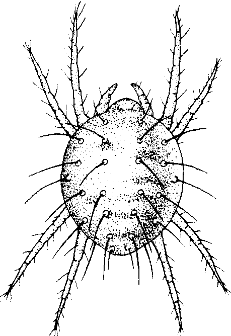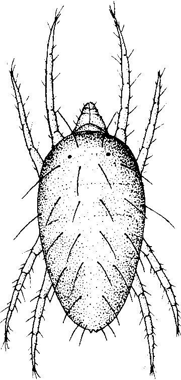 果苔螨 学名Bryobia rubrioculus(Schenten)。分布于欧洲、美洲、亚洲、大洋洲和非洲。在中国原是北方落叶果树的主要害螨,经有机磷等杀螨剂防治,已基本得到控制;仅在西北果区为害还较重。寄主有苹果、梨、桃、李、杏、沙果等。体长约600微米,宽约360微米。全体从背面看呈椭圆形,但实际是背平腹拱;侧视呈小船状。体绿褐至赤褐色,足及颚体黄绿色。背肤纹粗糙,不规则,约在前1/3处有一横沟,将前足体与后足体明显分开。前足体前方有乳突4个。背毛仙人掌状,白色,32根。其中前乳突末端各1根,眼点前、后方各1根,后足体边沿18根,中部6根,排列成两行。足4对。第一对略超过其体长,而显著长于其他各足。卵圆形,夏卵红褐,越冬卵紫红色(图3)。此螨尚未发现雄性个体。