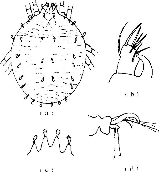 山楂叶螨 学名Tetranychus viennensis Za-cher。分布于亚洲、欧洲、大洋洲及中国华北、东北、西北和长江下游等果区。主害山楂、苹果、梨、桃、杏、樱桃等蔷薇科植物,亦可寄生于核桃,榛子,橡树等。雌成螨体椭圆形,长约530微米,宽约230微米。夏季繁殖型深红色,越冬滞育型呈橙黄色。足和颚体浅黄。背刚毛细长,共24根,其基部无疣状凸起。足爪变为两对粘毛,其爪间突为3对针状毛。须肢感器锥形,其长度约与基部宽度相等。口针鞘前方平钝,气门沟末端分支成球状。雄成螨呈倒梨形,体长约430微米,宽约200微米,黄绿色。阳具基部粗大,向末端渐收缩,在中部呈直角向背面弯曲,其端锤,前突短小,后突尖削指向后上方。卵圆形,黄白或白色(图2)。在中国河南年生12或13代,辽宁兴城发生五六代。以受精雌螨在寄主的枝干粗皮缝隙,树干基部周围的落叶下及土缝等处越冬。寄主发芽时开始出蛰,集中在幼嫩的芽叶上为害。日平均温度达15~16℃时开始产卵。一般在寄主花谢后出现幼螨。在春季温度较低,完成一世代需20多天; 夏季高温干旱期,7~8天即能完成一个世代。成螨及幼若螨都有吐丝结网习性,并可借丝随风传播。卵产于丝网上。春、秋季世代产卵较多,平均每雌产70~80粒,夏季世代则仅20~30粒。雌螨寿命亦以春、秋季世代较长,可达20~30天,夏季世代仅7~8天。在正常气候和营养条件下,初秋出现越冬型雌螨。但当寄主受害严重,营养条件恶化时,6、7月间亦可出现越冬个体。