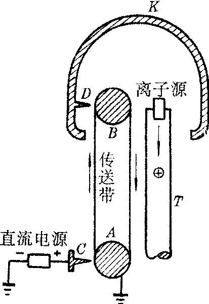 | 释义 | 范德格喇夫静电起电机Fandegelafu jingdian qidianji用以获得高速粒子的静电装置,又称静电加速器,它是R.J.范德格喇夫于1931年发现的。它几乎利用了静电平衡下导体(包括导体空腔)的所有性质。下图为静电加速器的示意图。图中K为近似于封闭的金属罩,叫做高压电极,T是抽成真空的加速管,管的上方有发射粒子的装置,叫做离子源。当K对地有高压时,就得到高速正离子流。获得高压电极的原理是一次又一次地重复将正电荷从金属罩内部全部给予电极。在两个金属轮A和B间装一条由橡胶布(绝缘材料)做成的传送带,带的下端附近装一排针尖C,针头与直流电源(电压约几万伏)的正极相联,电源的负极及轮A接地。传送带由于尖端喷射电荷(几万伏高压使尖端附近空气电离,负电荷跑向尖端,正电荷跑向传送带并附于其上)而带电,A接地是加强尖端的这种喷射作用。电动机带动轮A转动,使传送带带着正电荷向上运动。当其到达高压电压内尖端D处,传送带正电荷使尖端感应出负电荷。它们之间的强电场使空气电离,正离子跑向尖端,负离子跑向传送带,等效于将传送的正电荷从内部传送到金属罩k,这样,不断将正电荷连续的传递给k并分布于外表面,高压电极电压不断升高,直至它通过大气和绝缘柱的漏电所造成的电荷损失与从罩内获得的电荷相等时,电势维持恒定。范氏静电起电机的最高电压视金属球半径的大小而异,半径为1米的金属球约可产生1兆伏的(对地)高电压。为了减少大气中的漏电,提高电压,减小体积,可以将整个装置放在充有1×106~2×106帕压强的氮气钢罐中。由范氏加速器所获得的高速粒子流可供原子核反应实验之用。近些年来,在晶体管和集成电路等半导体器件的制造工艺中新发展了一种离子注入技术。制作半导体器件时,需要在半导体晶片中掺入某些杂质元素(如硼或磷)的离子。过去全靠扩散的方法来完成。离子注入技术是利用加速器使离子加速后形成高速离子流,然后用这些高速粒子来轰击半导体晶片而注入其中,达到一定的掺杂效果。这种离子注入法比传统的扩散法优越之处在于掺杂的条件易于控制。在离子注入所需粒子能量范围内(如速度在106米/秒的数量级),用范氏加速器加速离子是方便的。