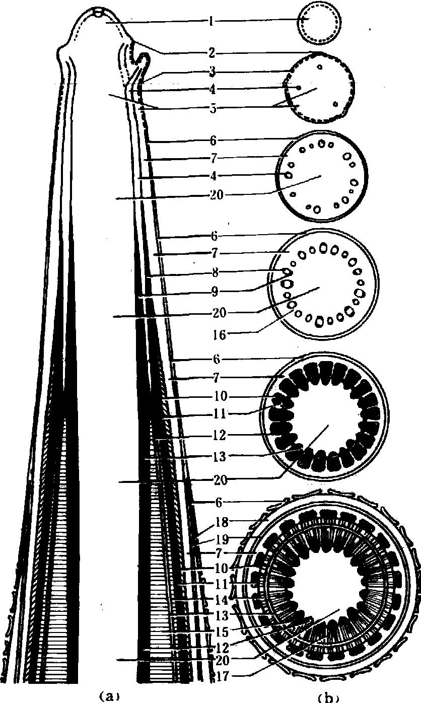 茎初生结构至次生结构的发育过程图解 (a)纵切面; (b)横切面