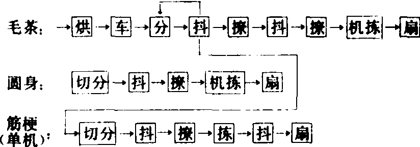 | 释义 | 茶叶精制联装线combination line of tearefining制茶成套设备之一。将各种茶叶精制机具配置联装, 以进行部分连续化生产。中国在50年代末期, 对精制联装进行了一次尝试, 即把外销绿茶的单只车色滚筒, 改成长甬道式滚筒, 把各单只的炒茶锅开成缺口连接起来, 上述两道工艺的间隔作业改成连续作业, 但这两种改革都没有达到质量要求, 至于后继工艺: 筛分、切细、拣梗、取料等工序, 当时未经过精确的流量测定和研究有效的贮存、控制及调节方法。因而联装因出现前后机组间生产率的严重不平衡而告失败。70年代初, 生产规模不断扩大, 对精制联装又开始新的探索,首先从单机着手, 逐步创造联装条件。1972年研制成功机组联装的自动车色机,这一革新不仅减轻了劳动强度,而且使人工间歇投料、出料, 改成自动化间歇投料、出料, 又将多方向出口的双层抖筛, 改进成长形单层单方向出口的抖筛, 并增加输送装置, 如振动槽、风管、桁车输送等。80年代已实现了从毛茶投料到剖扇取料、本身路到圆身路的熟取部分; 从烘干车色到清风割末的熟取部分这两大段落的联装。各地眉茶精制联装的主要方案有下列几种: ❶本身路和圆长身路茶占80%以上, 把这两路茶布置两套联装线。至于轻身路、筋梗路茶约占10%,作单机加工处理。