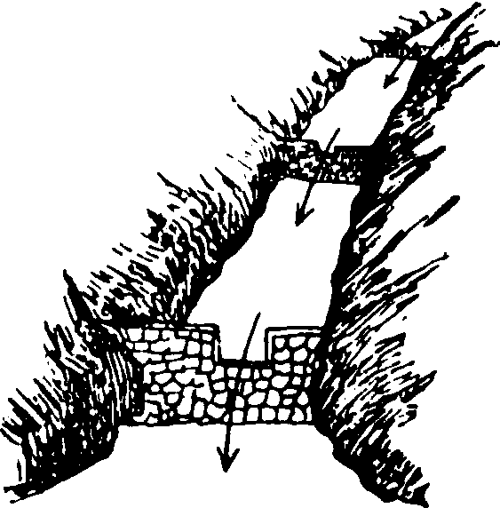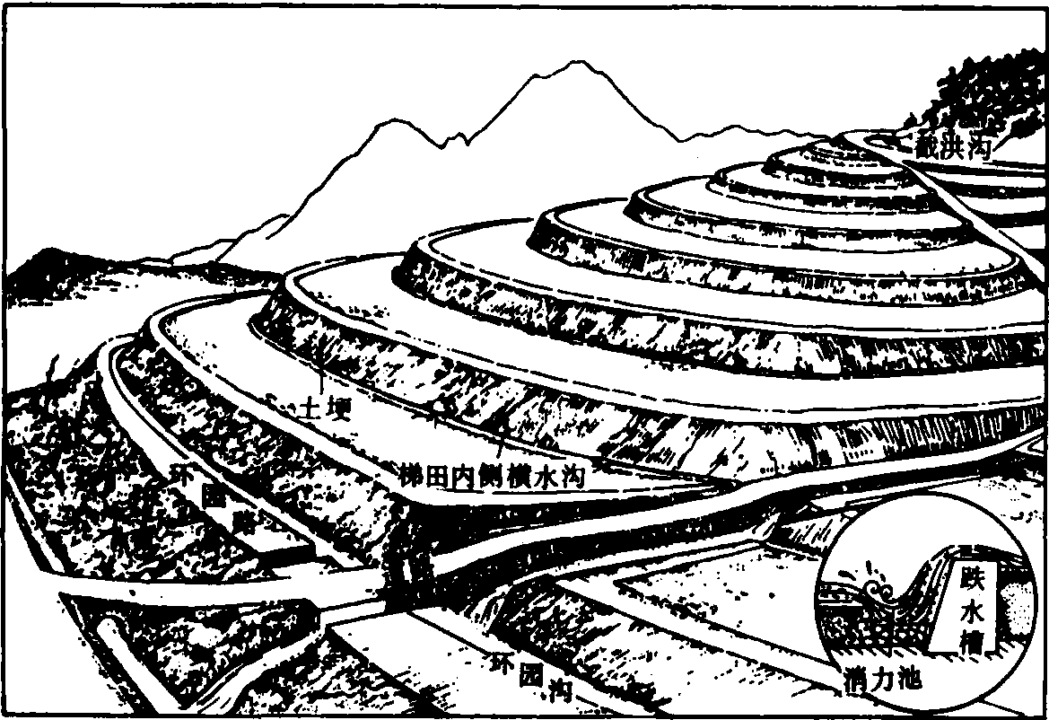 图1 茶园道路、水沟设计 茶园排灌系统设计 排水系统 茶园灌溉须建立引水系统, 二者应同时设计。一般茶园排水系统由横排水沟、纵排水沟、隔离沟等组成。横排水沟沿等高线安排在地块长边园路的上方。其作用就是截断地块本身的地面径流, 将多余的水引入纵排水沟。纵排水沟按山势设在山凹或丘陵地的低洼处, 尽量利用原有的山沟自上而下整理而成。其作用就是接纳横排水沟排出的水流入茶园下面的池塘或水库贮蓄起来, 也可直接排入河流。隔离沟也按等高线设立,设在茶园上方的也称撤水沟,其作用是防止上方的林地或荒地的流水冲入茶地(图2)。在茶园下方的隔离沟, 也称拦水沟, 设在茶园与农田的交界处。其作用是防止茶园的水直接冲入农田。
