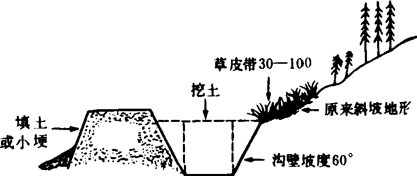 图2 等高隔离沟开垦法 灌溉系统 可分茶园流灌与喷灌两种, 应分别进行设计。流灌系统主要由主输水渠, 支输水渠,纵沟,横沟等组成。主输水渠的作用主要为承接机埠抽出或横排水沟进水。 自流水源而来的水输送至各支输水道。其断面设计依流量而定, 主输水渠宜设置在各个区茶园的较高处, 一般可与设在山上分水岭或山腰的主道, 支道并行, 以便分送水流进入各片茶园的支输水渠。支输水渠的作用主要为承接主输水渠之水进入园沟之用。其断面设计应依分水流量及地形特点而定。支输水渠宜设在各片茶园的上面较高处, 一般可与各山头山背上的主要园道并行, 以便分送水流进入园内纵沟。纵沟也可做成阶梯式, 以利灌溉。越过园道时, 应以涵管相接,以便操作和机械行走, 园内纵沟沟底较横水沟应略低,沟沿略高10~15厘米。横沟为接纳园内纵输水沟的水最后进入茶行, 达到流灌的目的。横沟一般不另行设置, 即利用茶园排水系统的但茶园地块较大,茶行较多, 则应加设临时横沟进行流灌(图3)。