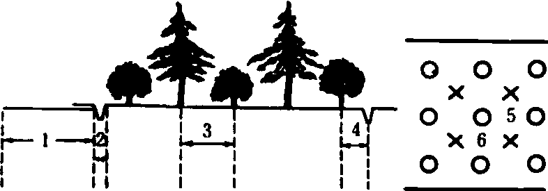 图3 纵排水沟 喷灌系统可分固定式喷灌, 移动式喷灌, 半固定喷灌三种。固定式喷灌,是在茶园中埋设干管和支管,在支管上隔一定距离设置竖管, 喷头在喷灌时装在固定的竖管上使用, 除喷头可随时取下和轮流在竖管上使用外, 其他都是固定的。这种装置除利用自然水头外, 要设立固定泵站。移动式喷灌, 是将动力、水泵、喷头安装在一个喷灌机上,沿明沟、暗沟进行喷灌。半移动式喷灌, 水泵和干管是固定的, 喷头和支管是可以移动的。在干管上装有给水栓, 由干管供水喷洒。 茶园排灌系统设计, 必须同时在适当地点安排建立水库、池塘等等, 以便蓄水提水, 排蓄灌兼顾。 茶园防护林与遮荫树设计 茶园防护林的主要作用为防风防寒, 保持水土涵养水源; 遮荫树的作用则为调节光强度, 降低叶温, 增加土壤养分, 保持旱季土壤水分。中国广大茶园,自北至南皆有风害寒害,水土冲刷为害, 皆应计划布置茶园防护林。至于茶园遮荫树, 一般认为中国南亚热带与热带茶区如云南、广西、广东的一部分与海南岛、台湾南部外,是可以不设置的。茶园防护林的设计,应注意防护林的布置与防护林的结构(图4)。
