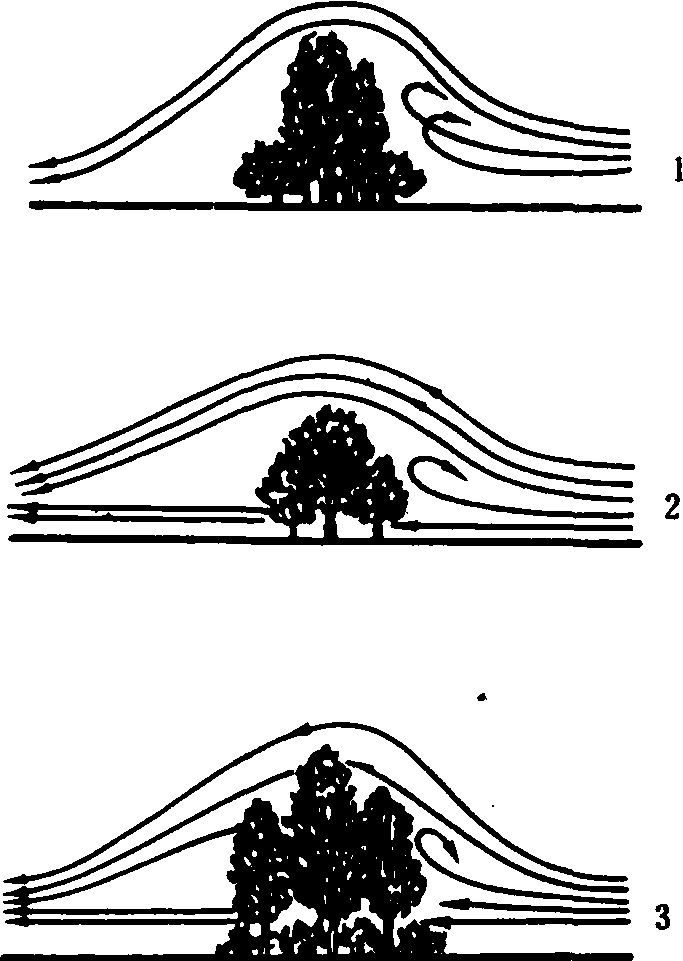 防护林带设计 一般丘陵山地茶园防护林是山上的分水岭与山间自然沟谷的两岸。防护林带应注意与已在这些区域设置的主道、支道、主输水渠、支输水渠以及自然纵排水沟互相配合。此外在丘陵山地茶园大面积的斜坡地, 也可以从下部到上部, 按等高线与设于山脚的主支道以及横园路、横排水沟相结合, 设置宽度较小的防护林带。防护林带应使其与主要风向相垂直, 有多方面的风向为害茶树时, 可与主要防护林带成垂直再设置副林带。 防护林带的结构 一般可分为紧密结构、稀疏结构、透风结构三种(图5)。