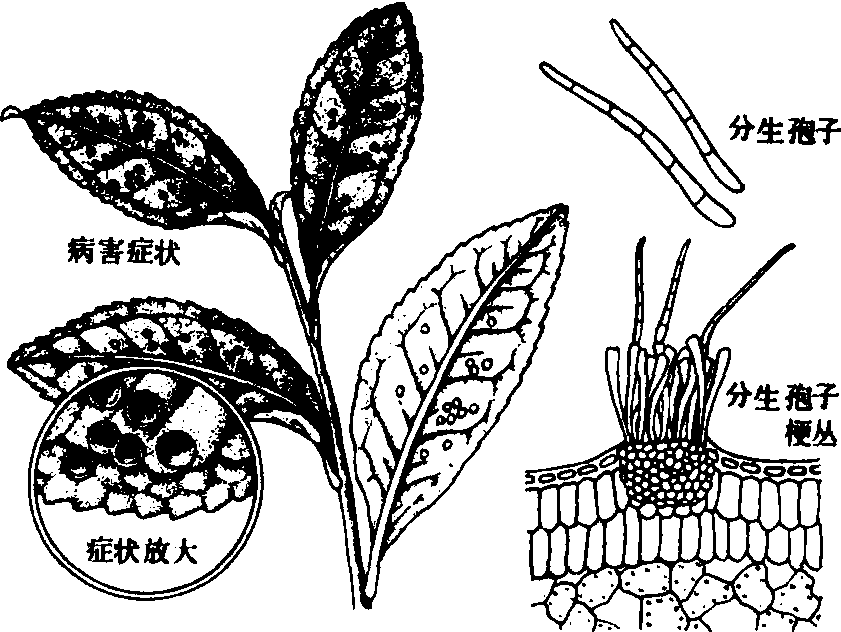 茶圆赤星病 侵染规律 以菌丝块在病叶上越冬, 翌年春季茶芽萌发, 抽生新叶时, 产生分生孢子, 借风、雨飞溅传播, 侵害早春嫩叶。凡日照短、阴湿雾大的茶园;或土层浅、茶树生长弱的茶苗; 或生长过于柔嫩的茶苗都易发病。年际间发病轻重不同, 品种间亦有明显的抗病性差异。 防治 见茶白星病。 茶圆赤星病Cercospora theae Bredde Haan茶树芽叶病害之一。初期呈褐色针头状小点,后扩大呈紫色,最后变灰白色,边缘深褐色,中央凹陷,圆或近圆形,病斑直径0.8—1.2毫米。危害严重时引起叶片脱落。 |