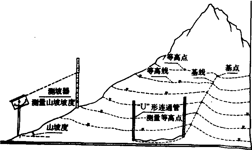 测量坡度、基线、等高线示意图 修筑梯级应由下而上。先将本级梯层线上部挖取底土填入下部, 造成初步的梯级面, 而后再从上一级梯层线范围内挖取全部表土铺在本梯层面上, 使大部分表土保留在地表。修筑时先在梯级等高线上做好清除疏松的表土与杂草树根的清基工作。梯基的宽度应根据梯壁构造的材料与梯壁的高度而定, 用石头或砖砌的一般为50厘米左右,用心土夯筑的酌量宽些,要求挖至实土, 并向内稍倾斜。接着就可在梯基上就地取材修筑梯壁。如用石块, 应选用大石块砌在梯壁的下层, 中石块砌在梯壁的中部或上方, 梯壁里面要在本梯线上部取心土填入踏实; 梯壁基要宽于梯壁面, 梯壁要稍向内倾斜。如用草砖,则应先把草割去,然后挖成长40厘米, 宽25厘米, 厚12厘米的砖块, 叠时草皮面向上, 叠成品字形, 块与块之间要紧密接合, 一边叠一边从梯层线上部取生土填入里面踏实, 如此依层叠高, 至稍高于梯级面外沿为止。如用泥土夯筑梯壁,就可直接先在梯层线上部挖取生土倾入梯壁基内,用脚一层层踏实, 堆土达到要求梯壁高度后, 在梯壁的内、外、上三面用木棍先外后内、先轻后重打紧打实。又不论修筑梯壁用何种材料, 在修筑梯壁的同时, 都要整理好梯级面。梯面要修成2°~3°外高内低的反倾斜。梯级面的外沿, 要求修筑一宽约30~40厘米, 高约15~20厘米的梯埂。梯级面的内侧, 要求挖出一条深约20~30厘米、宽约30~40厘米的背水沟,沟内每隔7米左右筑一低于沟面的拦水小坝, 以利分段蓄水。梯级面内侧挖土部分土层实而薄, 必须深翻50厘米以上, 并施有机质肥料以改良土壤。 水平梯级茶园开垦完成以后, 应加强经常性的保护工作。主要包括大雨前检查加固梯壁、疏通排蓄水系统, 大雨后检查修理塌方除砂清沟, 泥筑梯壁上种好多年牧草及绿肥等护土植物, 有条件地区还可在梯级面上覆盖防冲。 |