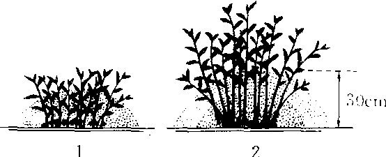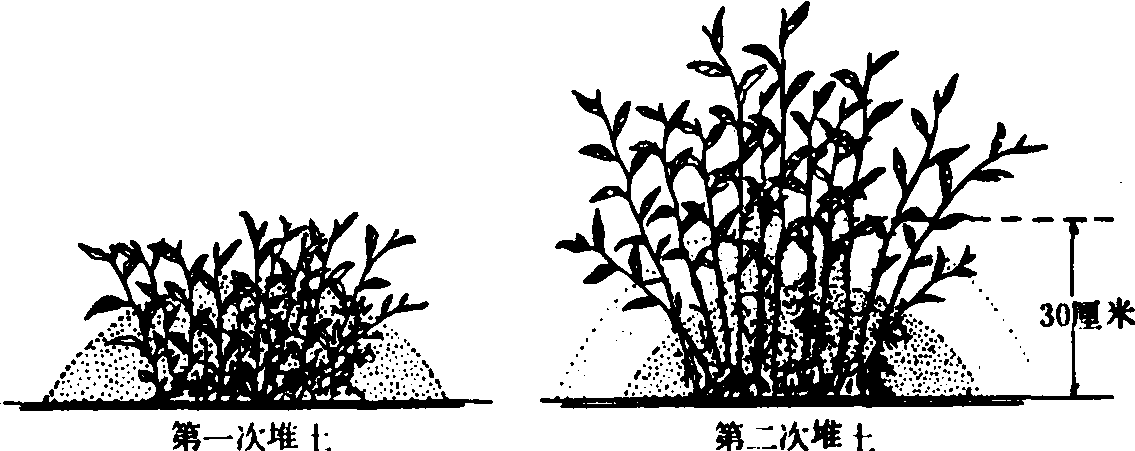 堆土压条繁殖法 1.第一次堆土 2.第二次堆土 |