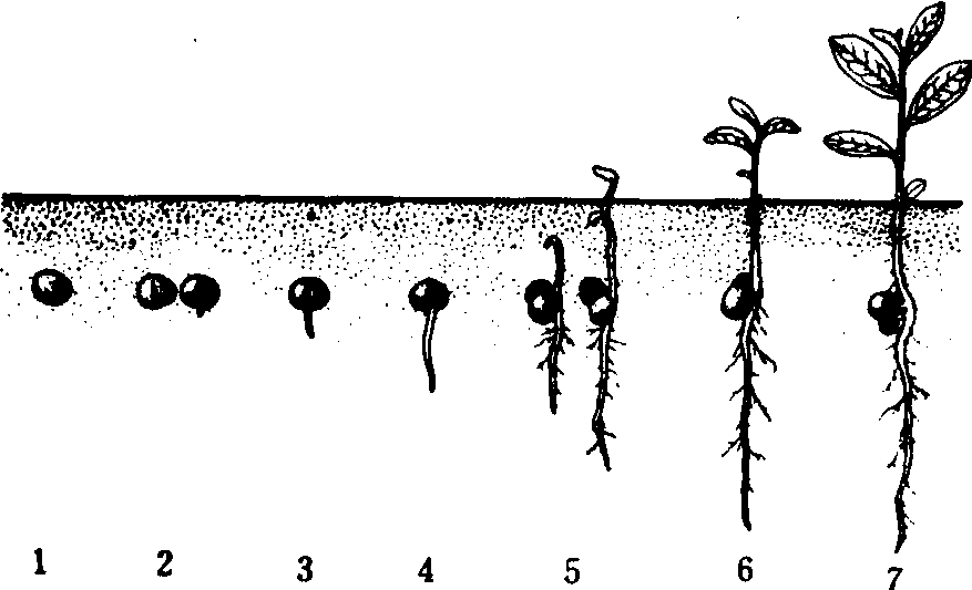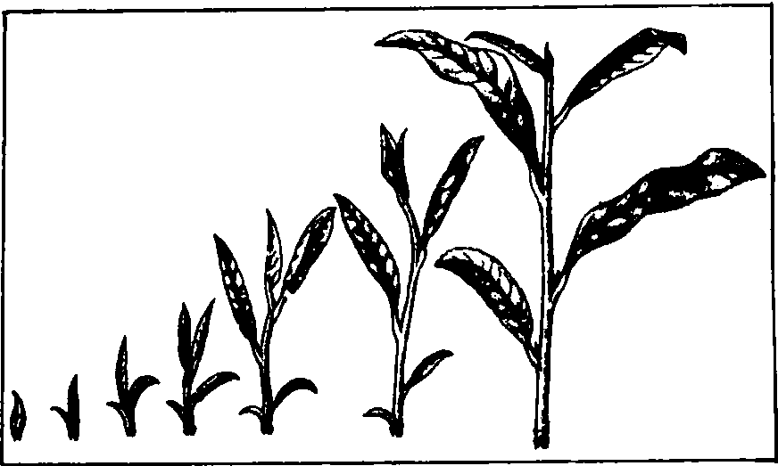 图2 茶籽萌发过程 1. 播种后茶籽 2—4.种皮破裂胚根伸长5. 胚芽伸长出土 6—7.展叶与休止 茶树年发育周期annual development period of teatree茶树在一年中营养生长和生殖生长的全过程。茶树根系生长的快慢与地上部生长交替进行,当地上部分生长旺盛时,根系生长就缓慢,因此它们在一年中各有3~4个生长高峰出现,即秋末地上部分休眠,而根系却无明显的休止现象;在一年中新梢生育表现出生长和休止相互交替现象形成轮性;在春季营养生长旺盛,到夏季后生殖生长开始活跃;花芽6~7月形成,10月左右开花,要到次年10月果实才能成熟。因此,年周期中茶树同时进行两种生殖过程:当年茶花孕蕾,开花授粉;茶果生育成熟。 |