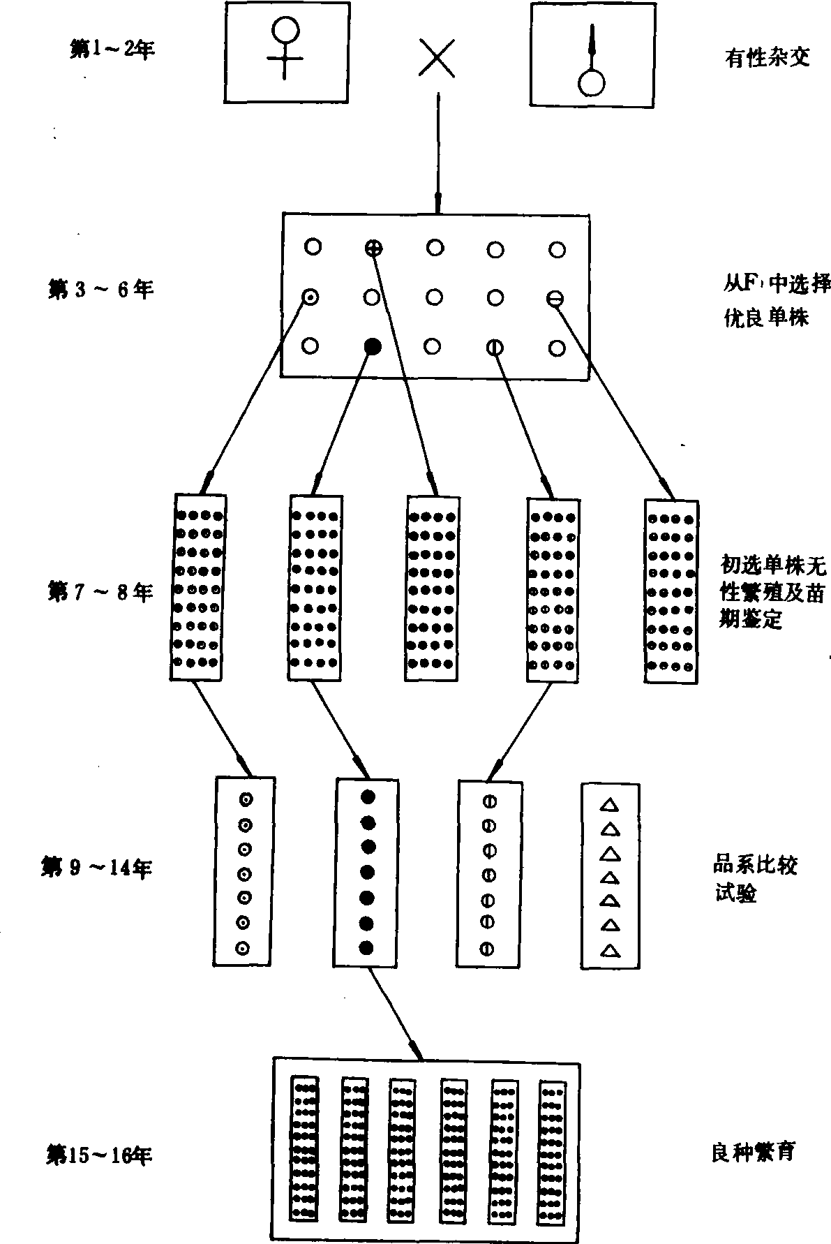 在茶树杂交育种中, 主要采用简单杂交与回交两种方式。杂交后代的选择, 主要采用单株选择法, 如杂交后代优良植株多, 也可采用集团选择法。不论采用哪种方法, 均应从苗期开始。苗期选择是根据某些相关性状来进行的。凡发根性能良好,茶苗高度适中,分枝与叶量较多, 叶片大小中等, 营养生长期长, 腋芽萌发力强以及抗逆性强的杂种后代, 往往有较大希望育成高产稳产良种。苗期品质鉴定, 主要观察芽叶持嫩性、叶色、茸毛多少、叶面隆起性与光泽性等,或茶树杂交育种图式采下二、三片嫩叶进行发酵性能鉴定(即氯仿鉴定法)。杂交后代一律采用单株定植, 行株距一般为150×150厘米, 以利于单株的生长发育与继续选择。对入选的优良单株或类型, 要及时进行扦插繁殖, 布置品系比较试验, 从而育成杂交新品种。