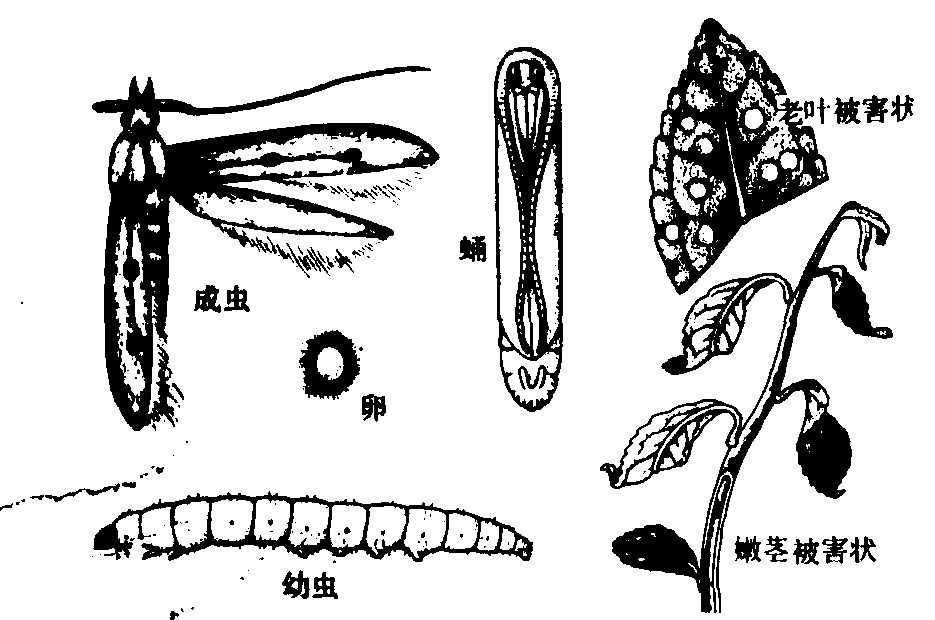 茶悄蛾 形态 成虫体长5~7毫米, 体翅均深褐色, 具金属光泽。翅狭长, 翅面散布黑色小点。前翅后缘近中央有2个圆形黑斑。前后翅后缘均有长缘毛, 触角丝状比前翅略长。卵椭圆形, 淡黄色。幼虫成长时体长6~10毫米,头部深咖啡色, 胸、腹部黄白色,体表稀覆短毛, 胸足淡色, 腹足不发达, 趾钩单序环, 臀足趾钩缺环。蛹长约5毫米, 黄褐色, 触角长达腹部第8节, 第10节腹面有一对棒状突起, 向上伸出,顶端有细钩刺。 生活习性 各地一年大都发生1代。在1代区,幼虫在叶片内和茶梢内越冬, 10月中至次年4月上旬陆续迁枝梢蛀食, 次年5月上、中旬为盛蛹期,5月下旬至6月上旬为成虫盛期,8~10月幼虫潜食叶片为防治关键期。福建部分地区一年可以发生两代,属2代区。以幼虫在芽梢内越冬,翌年4月下旬化蛹, 5月中旬羽化产卵, 6月上旬出现幼虫直接蛀食芽梢, 8~9月受害芽梢枯萎, 9月上旬化蛹, 9月中旬出现成虫。2代卵10月上旬孵化, 幼虫蛀入秋梢。各虫态历期: 卵10~15天, 幼虫在1代区270天以上, 在2代区90天左右。成虫夜间活动,产卵叶柄附近。1代区初孵幼虫潜入叶内潜食叶肉, 3龄后转蛀嫩梢; 2代区幼虫只蛀食芽梢。被蛀枝梢内孔道长约10厘米, 并留有蛀孔, 孔外有木屑状排泄物。 防治 加强苗木检疫,防止随茶苗传播蔓延。1代区幼虫未转蛀枝梢前, 8~10月喷施90%敌百虫、40%乐果1000倍液, 80%敌敌畏1500~2000倍液。为害严重茶园结合树冠改造, 早春进行轻修剪或重修剪, 剪下茶枝及时清出茶园处理。 茶梢蛾tea·mothParametriotes theae Kuz.,又称茶梢尖蛾、茶蛾、茶梢蛀蛾。鳞翅目、尖翅蛾科。分布于中国各主产茶省老茶区。为害茶、油茶、山茶。成虫体长5~7 mm,深褐色具金属光泽。翅狭长,前翅翅面散布小黑点,中部有2黑圆斑,后缘毛长。老熟幼虫体长6~10 mm,头深咖啡色,体黄白色,稀覆短毛。年多发生1代,以幼虫在叶内或嫩梢内越冬,成虫产卵于叶柄附近。初孵幼虫钻入叶内潜食叶肉,3龄开始转蛀嫩梢,致芽梢凋萎。宜注重茶苗运输检疫;早春进行修剪;秋季在幼虫潜叶期施药。 |