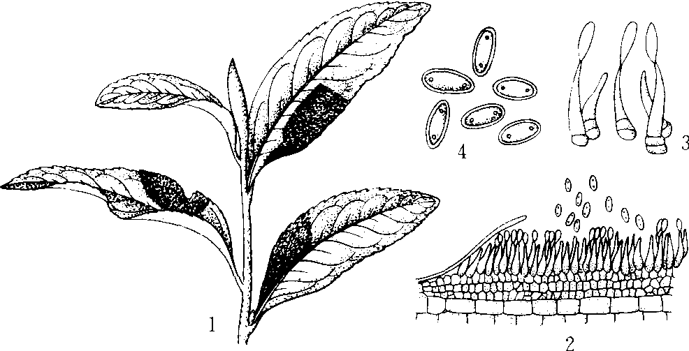 茶炭疽病 1.分生孢子盘 2.分生孢子梗 3. 分生孢子 4. 为害状 |