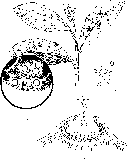 1.分生孢子器 2. 分生孢子 3.为害状