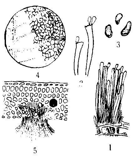 茶网饼病 1.子实层放大 2.担子和担孢子 3.担孢子 4.病症放大 5.病叶横切面 |