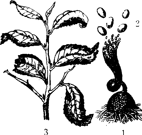 茶芽枯病 1.分生孢子器及分生孢子 2.分生孢子放大 3.病害症状 |