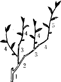 新梢生长轮次示意图 1. 去年老枝 2.头轮 3. 二轮 4. 三轮 5.四轮 |