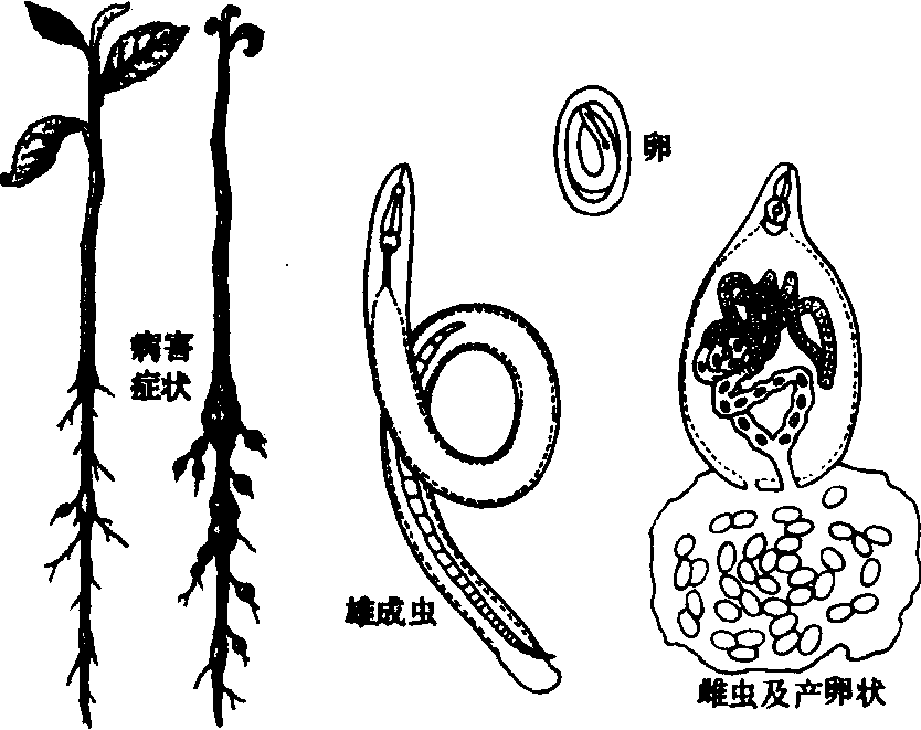 茶苗根结线虫病 病原 主要为南方根结线虫,学名为Meloidogyne-incognita (Kofoid and White head) Chitwood,其次为爪哇根结线虫学名为M.javanica(Treub.)Chitwood、花生根结线虫学名为M.arenaria(Neal)Chitwood和泰晤士根结线虫学名为M.thamesi Chit-wood, 国际上还记载有北方根结线虫学名为M.hal-pa Chitwood和短体根结线虫学名为 M. brevicaudaLoos, 后者除加害茶苗外, 还加害成龄茶树。上述各种线虫均属线形动物门、线虫纲垫刃目根结线虫科根结线虫属。一生有卵、幼虫和成虫三个发育时期。雄成虫线形, 长宽为1.20~1.50×0.03~0.04毫米; 雌成虫柠檬形,头部尖,身体膨大, 长宽为0.44~1.30×0.33~0.70毫米, 卵产于雌虫尾端的胶质卵囊内。 侵染规律 以雌成虫和卵在病根虫瘿中越冬。1龄幼虫在卵内生活, 从卵内孵出的是2龄幼虫, 通过土壤或虫瘿组织到达新根, 从根尖附近侵入, 固定寄生。成熟雄虫逸出根组织在土中自由生活, 寻找雌虫交配。当环境适宜时, 20~30天完成一代。病根残留组织和病土均可通过人为活动作远距离传播。砂质土利于发病, 熟地比生地发病重。1~2年生茶苗感病显著, 茶树品种间抗病性差异较大。 防治 必须强调“预防为主、综合防治”的原则。选用无病地育苗或植苗; 使用感病地时,约提前两个月在烈日下多次翻晒土壤, 杀灭土中线虫; 尽量选用适宜当地种植的高产抗病品种: 加强肥水管理、增强茶苗抗病能力; 控制病苗扩散; 有些国家还间作万寿菊抑制线虫种群数量; 使用涕灭威、呋喃丹、灭线磷、克线磷等进行化学防治。 茶苗根结线虫病tea seedling disease caused by rootknot nemtodes茶苗根部寄生性线虫病害。分布于中国各产茶省区。斯里兰卡、印度、日本和非洲等地茶区均有分布。为害茶树、烟、麻、桑、瓜等。在茶苗根部有大小不等的圆形瘿瘤,使须根少发或不发,地上部分矮小黄化。病原包括多种根结线虫,以南方根结线虫〔Meloidogyne incognita(Kof. & White) Chit.〕为主。属线形动物门根结线虫科。雄成虫线形,长宽1.20~1.50 mm×0.03~0.04 mm。雌成虫柠檬形,头部尖,大小0.44~1.30 mm×0.33~0.70 mm。以雌成虫和卵在病根虫瘿中越冬。线虫可通过病根残留组织和病土远距离传播。砂质土利于发病。1~2年生茶苗最易感染。宜选用无病土育苗,加强管理以增强茶苗抗病性;种植危地马拉草可起到诱集和减少线虫数量的作用;发生严重的苗圃可用灭线磷、呋喃丹等杀线虫剂。 |
