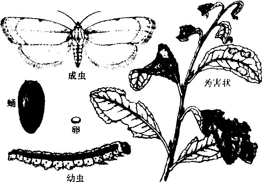 茶谷蛾 生活习性 福建每年发生3代,海南岛4代。1~4代幼虫分别于1月中旬、5月中旬、7月中旬及9月下旬盛孵。成虫日间栖于丛间, 夜晚活动、交尾, 无趋光性,不善飞翔, 每雌产卵200余粒, 散布叶背。幼虫在叠叶中咬食叶片,幼虫最多达8龄, 6~7龄时暴食,为害大。食性单一,只害茶, 耐饥力强, 迁移性小,老熟后即在虫苞内化蛹。喜在阴凉湿润的条件下发生,在海南岛全年以秋凉季节第3代虫口最多, 为害重, 12月底达高峰。其天敌有小茧蜂、大腿蜂和寄生蝇。 防治 结合修剪,清园灭虫。幼龄幼虫期喷用80%敌敌畏或50%辛硫磷800~1 000倍液。 茶谷蛾tea tineididAgriophara rhombata Meyr,又称茶木蛾。鳞翅目,谷蛾科。分布于云南、广东、海南、福建、台湾等省;印度、印度尼西亚也有分布。成虫翅展24~25 mm,浅灰黄白色,胸背有一黑圆点,前翅基中部有—淡黑纵纹,外缘有一列黑点。末龄幼虫体长20~28 mm,头黑色,体淡黄,背侧有黑色宽带纵贯全身,臀板黑色。年发生3~4代。成虫无趋光性,不善飞。卵散布叶背。幼虫可达8龄,吐丝缀叶蚕食,初龄时亦可蛀害嫩梢,老熟后即在叶苞内化蛹。可结合修剪清园灭虫;幼龄时喷施农药防治。 |