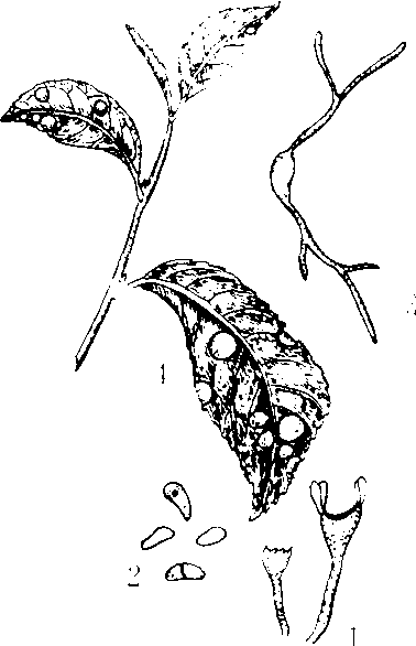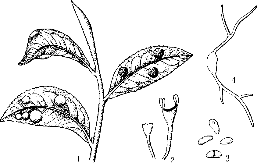 病因 病原物为坏损外担菌属担子菌,外担菌目。1895年马西(G. W.Massee)确定其病原物为Exo basidiumvexans Massee,无性态在自然界尚未发现。病斑突起部分的粉末即病菌的子实层,生于叶片下表皮,成熟后,菌丝体顶部生担子,担子棍棒状,大小30~50×3~6(微米),顶生2~4个小梗,长3~4.5微米,每个小梗上顶生1个担孢子。担孢子肾形或椭圆形,无色,单胞,大小9~16×3.5~6(微米),后形成双胞担孢子,大小14~17×3.5~5.6(微米)。茶饼病菌是一种专性寄生菌。印度发现该病菌有2个生理小种。担孢子寿命短,对短光波高度敏感,紫外光照射45分钟,可致死。相对湿度大于90%,或有水膜,温度在25℃以下,最适于孢子萌芽。致死温度为35℃以上。
