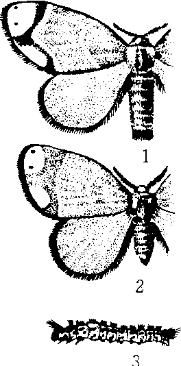 茶黄毒蛾 1. 雌成虫 2. 雄成虫 3. 幼虫 茶黄毒蛾毒蛾科昆虫的1种。雄蛾棕褐色,稀布黑色鳞,前翅前缘橙黄色,顶角和臀角各有1橙黄色斑,顶角黄斑内有2个黑色圆点;内线橙黄色,缘毛橙黄色,中部棕褐色;后翅无斑纹,缘毛橙黄色,第2代以后雄蛾翅黄色,与雌蛾相似。雌蛾体黄褐色,前翅浅橙黄色或黄褐色,除前翅前缘、顶角和臀角外,稀布黑褐色鳞片,顶角黄斑内有2个黑色圆点;后翅浅橙黄色或浅褐黄色,外缘和缘毛橙黄色。翅展雄蛾20~26mm,雌蛾30~35mm。幼虫体长10~20mm,在浙江、江苏、安徽、四川、贵州、陕西等地1年发生2代,在江西、湖南、广西1年发生3代,在福建1年发生3~4代。以卵越冬,越冬卵多产于树冠1m以下的萌芽枝条上或茶叶的反面。3月中下旬越冬卵孵化,3龄前的幼虫常10~100余头群集一起取食叶肉,3龄以后成群迁至茶树上部分散为害,幼虫怕光和高温,下午4点左右上树为害;老熟幼虫于5月中旬群集树下,在枯枝落叶层下、根际松土表层下、树干裂缝中化蛹。5月下旬开始羽化出成虫。每一卵块由50~300粒卵组成,卵块外被黄色茸毛。6月中旬第2代幼虫孵化,7月中旬化蛹,8月上旬羽化;8月中旬第3代幼虫孵化,9月下旬化蛹,10月上旬羽化。 |