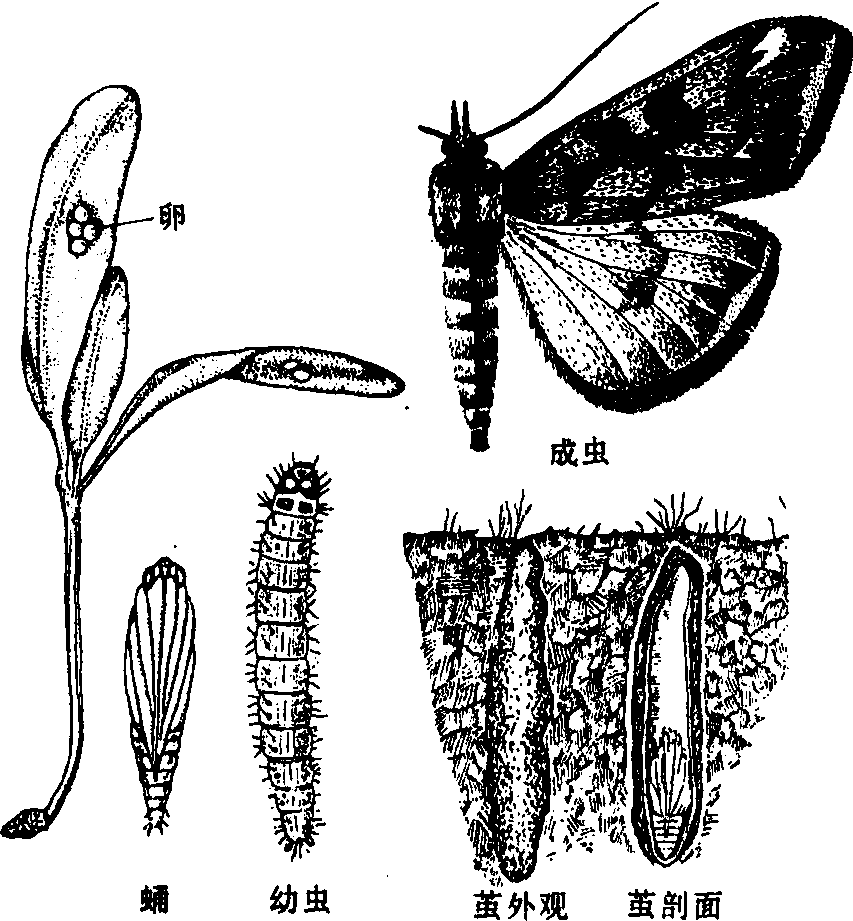 草地螟 发生规律 草地螟为突发性、间歇性大发生害虫,其发生决定于: ❶越冬基数。草地螟大量发生的北限为7月份18℃等温线地区,越冬幼虫可耐-30℃低温,在黑龙江可以越冬,高密度时每平方米可达400余头,但未必为主要虫源。在山西、陕西等越冬基地内虫源基数很大时,也将影响到迁飞范围地区内成虫大发生。 ❷迁飞。草地螟成虫具迁飞习性,除被动飞行外,尚有夜间低温时趋热性迁飞和白天灼热时趋湿性迁飞。越冬代成虫羽化后,在日落后地表气温迅速降低时常主动起飞高达50~100米处,随6~7米/秒的风力作远距离被动迁飞。旱热天气白天表土温度高达32℃,成虫起飞迁往湿、凉场所,晚间气温均匀或多云有雨时降落。干旱区局部降雨后可招致蛾群集中。一昼夜可迁飞250~300公里,成虫可迁飞到离原发生地1 000公里或更远地区,而导致迁入地区的大发生。 ❸越冬代成虫卵量、卵的发育情况及初龄幼虫的存活。卵量决定于前一年幼虫期营养、蛹体重量、化蛹和迁飞时温湿条件及蛾的营养。如前一年末代幼虫以取食藜科植物为主,蛹重就高,其雌蛾产卵多。将羽化时环境干燥,其蛹重和其后蛾产卵量都减少。蛹重30毫克以上出的雌蛾只需饲水即可产卵,无须再补充营养。雌蛾在不适条件下可不孕,蛾量大不一定导致以后幼虫的大量发生。 防治方法 根据越冬基地越冬幼虫基数和成虫发生期黑光灯诱蛾量,结合雌蛾抱卵剖查和气象预测,可对当年幼虫发生程度进行综合判断。如6月上、中旬灯下蛾量超过5 000头,卵粒可辨及卵成熟雌蛾占60%以上,旬平均气温高于17℃、相对湿度在60~80%时,幼虫有大发生可能。秋末春初土壤耕翻耙捞,能直接杀伤越冬幼虫或破坏正常化蛹及羽化通道; 幼虫入土结茧期间易受白僵菌侵染,自然寄生率颇高,施用菌剂可收持久性防效,对为害盛期前幼虫亦可侵染致病,苏芸金杆菌对幼龄幼虫也具有较高致病力,卵期可释放赤眼蜂防治; 幼虫发生期间可用甲基对硫磷、辛硫磷等防治1~2龄幼虫,卵期可施用灭幼脲; 此外,利用黑光灯和草地螟性诱剂可诱杀大量成虫。 草地螟meadow moth,beet webwormLoxostegesticticalis (L.),又名网锥额野螟、甜菜网螟、黄绿条螟。昆虫纲,鳞翅目,螟蛾科。分布于华北、东北、西北;欧洲、北美及朝鲜、韩国、日本也有分布。寄主有甜菜、豆类、麻类、薯类、玉米、高粱。成虫翅展24~26 mm,灰褐色;前翅有暗褐色斑,外缘有淡黄色条纹,中室内有~长方形黄白色斑;后翅灰色,外缘有两条黑色平行波纹。末龄幼虫体长19~21 mm,灰绿色,头黑色有白斑;胸腹部具暗色纵带,间有黄绿色波状细纵线;腹部各节毛瘤黑色,有两层同心的黄白圆环。一年发生1~4代,以末龄幼虫在土中结茧越冬。成虫喜食花蜜,有成群迁移习性,卵产于寄主茎叶上,单产或3、4粒排列成覆瓦状。初龄幼虫取食叶肉,3龄啮食叶片,有吐丝结网习性,受惊后即作螺旋状后退或波浪状跳动,老熟后入土吐丝结茧化蛹。可拉网消灭成虫;结合中耕和秋耕消灭虫蛹;在幼虫盛发期喷洒农药毒杀。 |