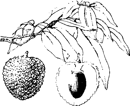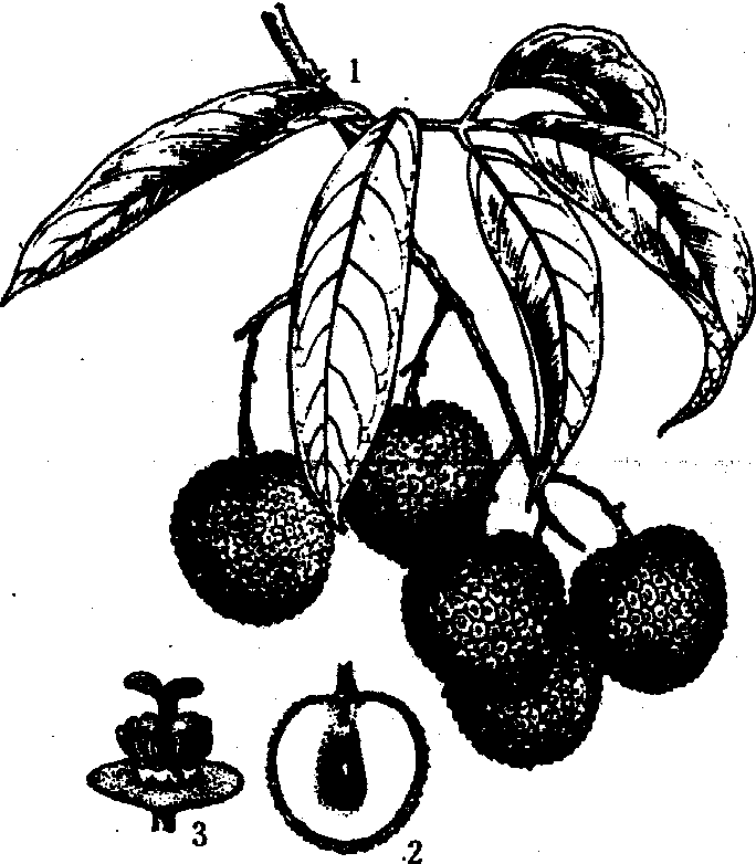 荔枝lycheeLitchichinensis Sonn.,无患子科,荔枝属。常绿乔木。2n=30。原产于中国南方。主产广东、福建和广西等省区。是重要的特产果树。树高8 m以上,枝多弯曲。羽状复叶,小叶2~4对,革质;新叶带紫红色。圆锥状聚伞花序,顶生,花小;子房2~3室,通常仅一室发育形成果实。果球形或卵形,红色或紫红色;外果皮革质,有瘤状突起,形成龟裂片、片峰和裂纹;果肉由种子胎座处发生的假种皮形成,乳白色半透明,甜酸多汁,风味佳。种子长圆形,褐色光亮。对土壤适应性广。用嫁接或压条繁殖。果供鲜食外,也是酿酒、罐藏、干果的原料。