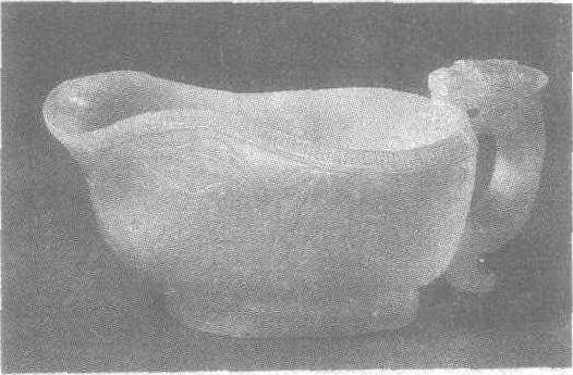 明早期。高6厘米,通柄宽14.5厘米。北京故宫博物院藏。青玉琢制,上有黄斑。仿商周青铜匜,作酒器,口沿微敛,形状为弯曲的水波样。宽流,器身呈椭圆形,圈足。口沿至腹下部雕琢一龙形柄。口沿和圈足各饰阳刻回纹一周,腹部隐起折枝荔枝,枝繁叶茂,风格趋向写实,具有明早期琢玉的典型性。