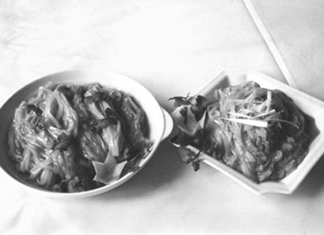 | 释义 | 荞麦凉粉qiɑomɑiliɑnɡfen地方风味小吃。流行于彬县一带。因用荞麦面掺水制作而成,故名。制作工序:先将荞麦脱皮、簸净,筛掉细面留下糁子。再用饭碗按14碗荞麦糁,拌入微量水潮湿15分钟,通过加工,使之变软。然后把潮湿后的荞麦糁反复搓揉,拌匀后搁置9小时左右。随即准备七脸盆水,倒入锅内烧开,加入适量碱面,将沉淀好的荞麦糁入锅加热一小时后,出锅到脸盆中晾凉,即成凉粉。最后将凉粉用专用漏子漏成丝,加入盐、醋、蒜末、味精、辣椒油、酱油等调料即成。食时清凉爽口,增进食欲,醒脑提神,具有降血脂、降血压的作用。冬季可以热炒食用,平时可以晒凉粉干。