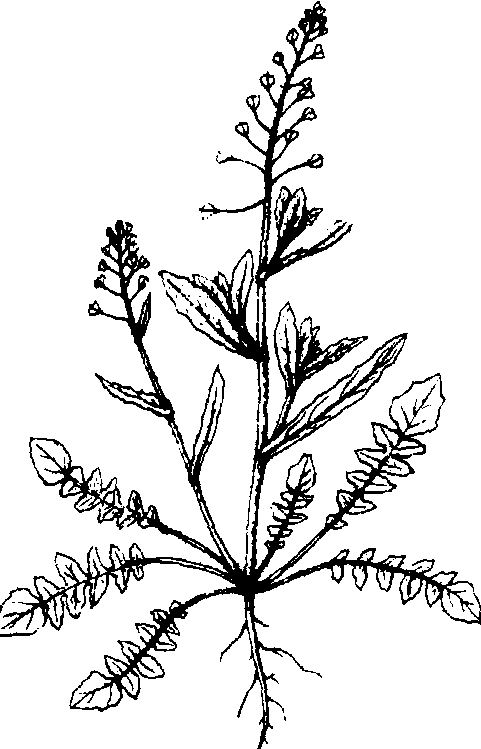 荠菜(散叶种) 荠菜❶一年生或越年生草本,高12—46厘米。茎直立或于基部分枝。基生叶多数。总状花序顶生或腋生。种子多数,长椭圆形,黄褐色。花果期5—7月。产阿勒泰、托里、伊宁、新源、特克斯、巩留、昭苏、沙湾、石河子、奇台、乌鲁木齐、玛纳斯、和静等地。嫩株作蔬菜。带花、果的全草可入药,性凉、味甘淡,有凉血止血的功能。主治吐血、尿血、崩漏、痢疾、肾炎、乳糜尿等病症。全草含荠菜酸、生物碱、氨基酸、黄酮类等成分。 |