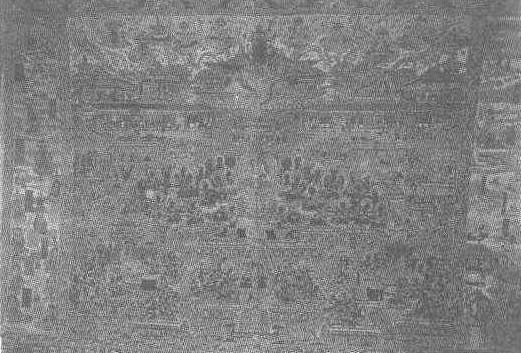 | 释义 | 药师经变图壁画盛唐。纵530厘米,横750厘米。甘肃省敦煌县莫高窟第148窟东壁北侧壁画。《药师经变》是据《佛说药师本愿经》绘制,它的布局与《观无量寿经变》相同,也采取“三联式”。中部为“极乐世界”,两侧分别是立轴式的“九横死”和“十二大愿”。极乐世界的画面中央有一大型平台。药师佛托钵结跏趺坐于莲台上。头顶悬华丽的宝盖,并放光万道。佛两旁有日光、月光二胁侍,其余的听法会众、神将列置两旁。佛前平台上伎乐演奏笙笛、排箫、琵琶、筝等多种乐器。中间二人挥巾对舞。宝池中莲花盛开,化生童子在水中嬉戏。佛的身后是庞大的建筑群。中轴线上的大殿有单檐和重檐两种,并由回廓和虹桥与两侧的配殿相连。此时的建筑界画技已较为成熟,透视技法准确,并能把握建筑物之间的比例。画面上空诸佛纷纷而至,天乐自鸣。整个场面宏大而壮观,分布井然有序,是莫高窟最大的《药师经变》壁画。