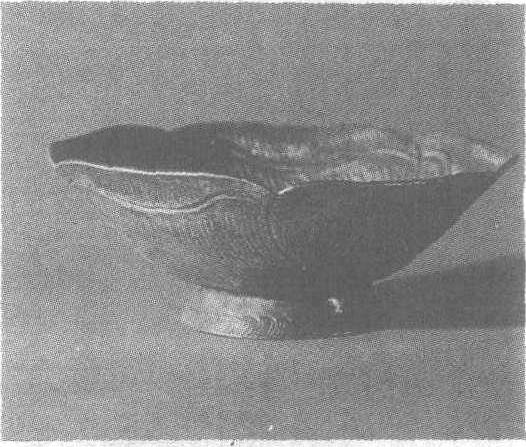 辽。高3.8厘米,口径10厘米,足径4.6厘米。1978年8月内蒙古自治区巴林右旗辽窖出土。内蒙古自治区巴林右旗文物馆藏。此杯大敞口,圆唇,斜壁,圜底,圈足。杯身用银片锤揲成五瓣荷叶形,在杯壁内外錾刻有荷叶脉纹,内底尚有一突起的重瓣梅花,圈足上刻有花瓣边一周,做工精细大放。