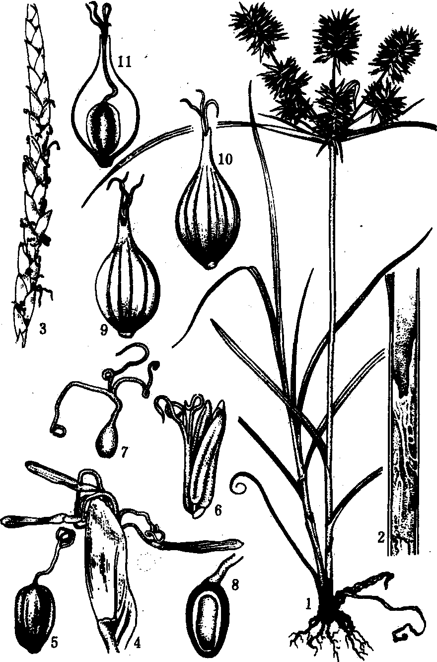 油莎豆与喙囊苔草 (1~8. 油莎豆; 9~10. 喙囊苔草) 莎草科sedge family;Cyperaceae单子叶植物,多年生草本,少为一年生草本。常有根状茎。秆实心,常为三棱形。叶基生或兼秆生,一般具闭合的叶鞘和狭长的叶片,有的仅有鞘而无叶片。花小,两性或单性,生于鳞片的腋内,鳞片呈螺旋状排列或2列,2至多花组成小穗;小穗再排成穗状、总状、圆锥状、头状或聚伞等各种花序;无花被或花被退化成下位刚毛;雄蕊多为3,少有2~1;子房上位,1室,有直立的胚珠1,花柱1,柱头2~3。果为瘦果或小坚果。染色体x=5~60。本科约80余属,4 000余种,广布于各大洲。中国有31属,670多种,全国均产之。其中荸荠球茎可供食用;油莎豆块茎含有丰富的脂肪,提取供食用和工业用;莎草和纤秆珍珠茅〔Scleria pergracilis(Nees) Kunth〕可提取芳香油;荆三棱、藨草、水葱、萤蔺、毛轴莎草(Cyperus pilosus Vahl)、筛草(Carex kobomugi Ohwi)等可作造纸原料;水葱、莎草、筛草、镜子苔草(Carex phacotaSpreng.)可入药;水虱草、山蔺(Fimbritylis subbispicata Nees etMeyen)、尖嘴苔草(Carex leiorhyncha C. A. Mey.)可作饲料。此外,飘拂草、咸草、牛毛毡、针蔺等为常见杂草。 |