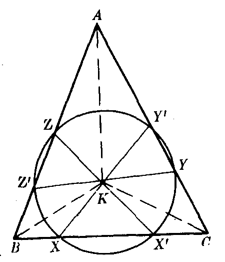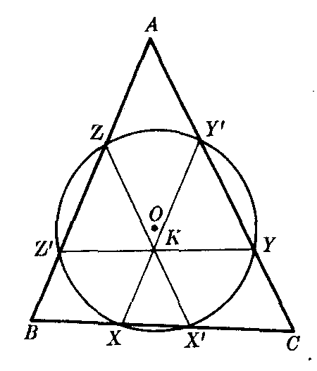 | 释义 | 莱莫恩圆laimoen yuan过三角形的陪位重心所作三边的平行线与周界的六个交点所在的圆.如图1,K为△ABC的陪位重心,XY′∥BA,YZ′∥CB,ZX′∥AC.则X,X′Y,Y′,Z,Z′六点共圆.