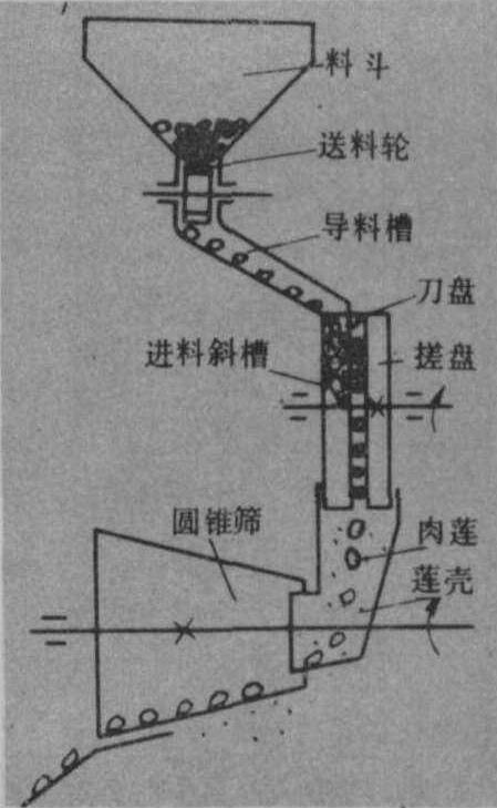 图2 撞击式莲子剥壳机工作原理 滚搓式莲子剥壳机的工效较高,每小时可剥莲子50~100千克,但对加工的莲子要求按颗粒大小进行分级,刀具刃磨调试要求严格,破碎率也偏高,适用于加工量大的工厂。撞击式莲子剥壳机只用一对刀头,适宜于不同品种和大小的莲子剥壳,破碎率较低,但工效也较低,每小时可剥莲子6千克左右,适用于小批量加工的工厂。机剥莲子的含水量以8%左右为宜。 |