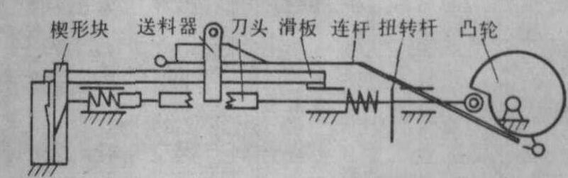 图1 圆盘滚搓式莲子剥壳机 撞击式莲子剥壳机 其工作原理是从莲子长径方向切入莲子壳并使壳扭碎而实现脱壳。结构如图2,工作时,送料器先将莲子从料斗中纵向送到前后刀头之间,使莲子的长径方向对准前后刀头,将莲子夹持,借楔形块自动定位,使前后刀头与莲子之间无间隙;刀头再各纵向进刀1毫米左右(相当莲壳厚度,此厚度可视莲壳的厚度进行调节),接着前刀杆在扭转杆的带动下旋转一定的角度,将莲壳扭碎,前刀头快速退回,同时楔形块抬起,壳、肉已分离的莲子掉入分选筛,壳、肉从不同的出口排出,整个工作过程都由凸轮和连杆控制。
