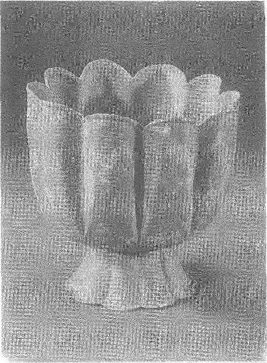 宋。高11.9厘米,口径11.6厘米,足高3厘米。1980年11月陕西省扶风县西坡村出土。陕西省扶风县博物馆藏。此杯为直口,深腹,高圈足。杯身锤揲成十曲莲瓣形,下边有外展莲瓣形高圈足与圜底相接。其造形独特。