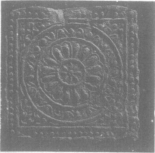 唐。长、宽均33厘米,厚6厘米。1957年陕西省西安市唐大明宫遗址出土。北京中国历史博物馆藏。此砖为唐代长安宫殿常用的铺地砖,表面印有繁缛的纹饰:由中心向外分别是双重莲花,多方连续的波浪,云头形花草及联珠纹。美观大方,繁而不乱。