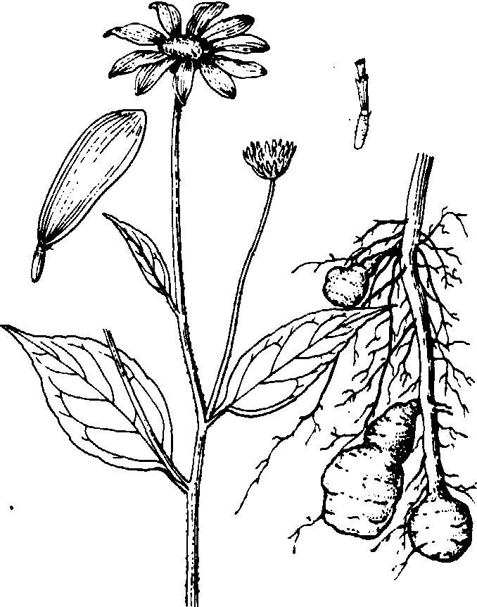 菊芋 菊芋别名洋姜、洋生姜。多年生草本,高约3米。地下有块根及纤维根,茎直立。茎生叶下部对生,叶卵形或卵状椭圆形,上部叶互生,叶长椭圆形至宽披针形。头状花序少,多生于枝端。瘦果楔形。花期9—10月。新疆各地有栽培。块茎俗称洋姜或洋生姜。可作酱菜及成菜。块茎含有丰富的淀粉,是优良的汁饲料,也可制作酒精及菊糖,菊糖在医药上是治疗糖尿病的良药。 |