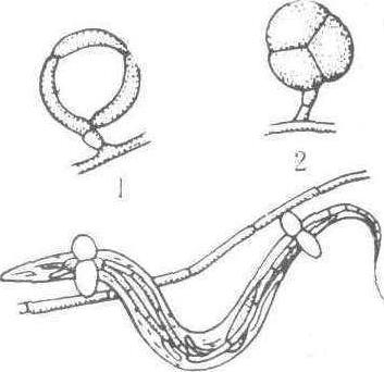 菌套 1.未膨大的菌套 2.膨大的菌套 3. 线虫被两个膨大的菌套捉住 |