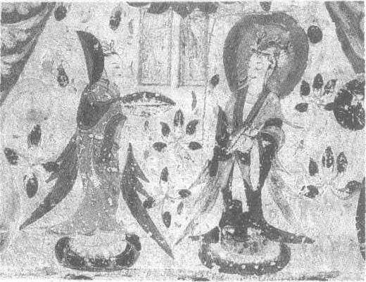 | 释义 | 菩萨图壁画西魏。纵35厘米,横45厘米。甘肃省敦煌县莫高窟第285窟北壁东侧下壁画。图中的两身菩萨立于莲座之上,头戴花冠,身着双领下垂的汉式长裙,衣纹飘洒,自然。面容秀丽,具有脱俗的风采,令人感到亲切可敬。一位手持花苞,另一位双手捧盆,两者的表情相呼应,使画面有整体感。朵朵莲花点缀于二位菩萨身旁。此图以白粉涂底,赋色明快爽朗,兼用中原式晕染,线描精细,具有典型的中原式风格。